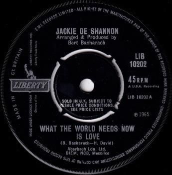 1960年代のウェスト・コーストを代表するアイドルで、才気溢れる名ソングライター、ジャッキー・デシャノンを代表する1965年のナンバーで、バート・バカラック&ハル・デイヴィッドの提供による珠玉の名曲「What the World Needs Now Is Love(世界は愛を求めている)」。更にB面にはLouis Brooks And His Hi-Toppersの1955年のR&Bナンバー「It's Love Baby (24 Hours A Day)」のジャック・ニッチェによる烈々たるアレンジに悶絶する狂暴フリークビート・カヴァーを収録した1965年のUK盤ダブル・サイダー7インチ。