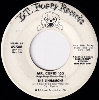 米国のマイナー60'sガールズ・グループCinnamons(Cinnamon Angels)がTokensが設立した小レーベル"B.T. Puppy Records"に残した1965年の傑作シングル。後にBig GuysもカヴァーしたTokens「Mr. Cupid (Don't You Call On Me)」のアッパー・カヴァーに、極上のファンキー・モッド・ダンサー「Dance To The Music」を収録したWサイダー盤。この7インチとてつもなく爆音!