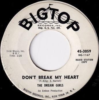 デトロイトで最も知られていないガールズ・グループの一つとも言われる4人組ガールズ・グループDream Girlsの1960年のシングル。リードボーカルのボビー・スミスのソウルフルで艶のある歌声が最高クールなGirls Boppin' Rock 'n' Roll「Don't Break My Heart」、「I Could Write A Book」を収録したUSプロモ・オリジナル盤7インチ。