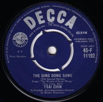 映画『007は二度死ぬ』や『Blowup(欲望)』にも出演した旧中華民国出身の女優Tsai Chinの1959年のデビューシングル。様々なアーティスト達によってカヴァーされアジア圏ではポピュラーソングとなった オリエンタル・ムード満点のチャイニーズ・ちゃんぽん・ポップ「The Ding Dong Song」にチャイニーズ歌謡「The Second Spring (第二春)」を収録したUK DECCAオリジナル盤7インチ。
