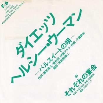 味の素の低カロリー甘味料"パルスイート"のCMソングを収録した1989年のプロモ盤オンリー非売品7インチ。CMでは桜田淳子さんが歌っていたようなのですが、こちらはダイエッツなる詳細不明なグループによるバージョンを収録しておりまして、「ムーンライト伝説」の作者として有名な小諸鉄矢(吉江一男)が手掛けたシティポップ〜ユーロ歌謡傑作ナンバー「ヘルシー・ウーマン〜パルスイートの唄〜」は極一部の世代に爆発的にウケます!B面には変な宴会ソングが収録しておりまして、こっちも凄い盛り上がります♪