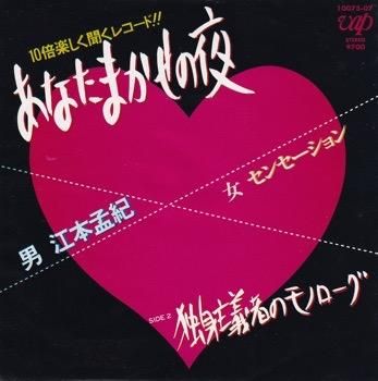 球界一のモテ男、エモやんこと江本孟紀がジャジー&アーバン・メロウなトラックにのせて夜の心得を延々と語る"円楽のプレイボーイ講座"的な最高のキラーレコード。B面「独身主義者のモノローグ」もとってもお薦めでございます♪こういうレコードに出会う為に和モノを掘っていると言っても過言ではない程の大好き盤!